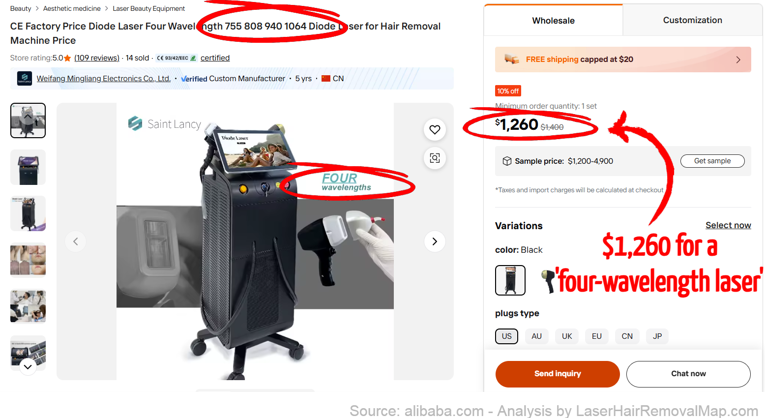 Machines from manufacturers like Bomeitong (Beijing), Weifang Mingliang, and dozens of other OEM factories now advertise 755nm + 808nm + 940nm + 1064nm. Four wavelengths in a single handpiece for around $1,200–$5,000.